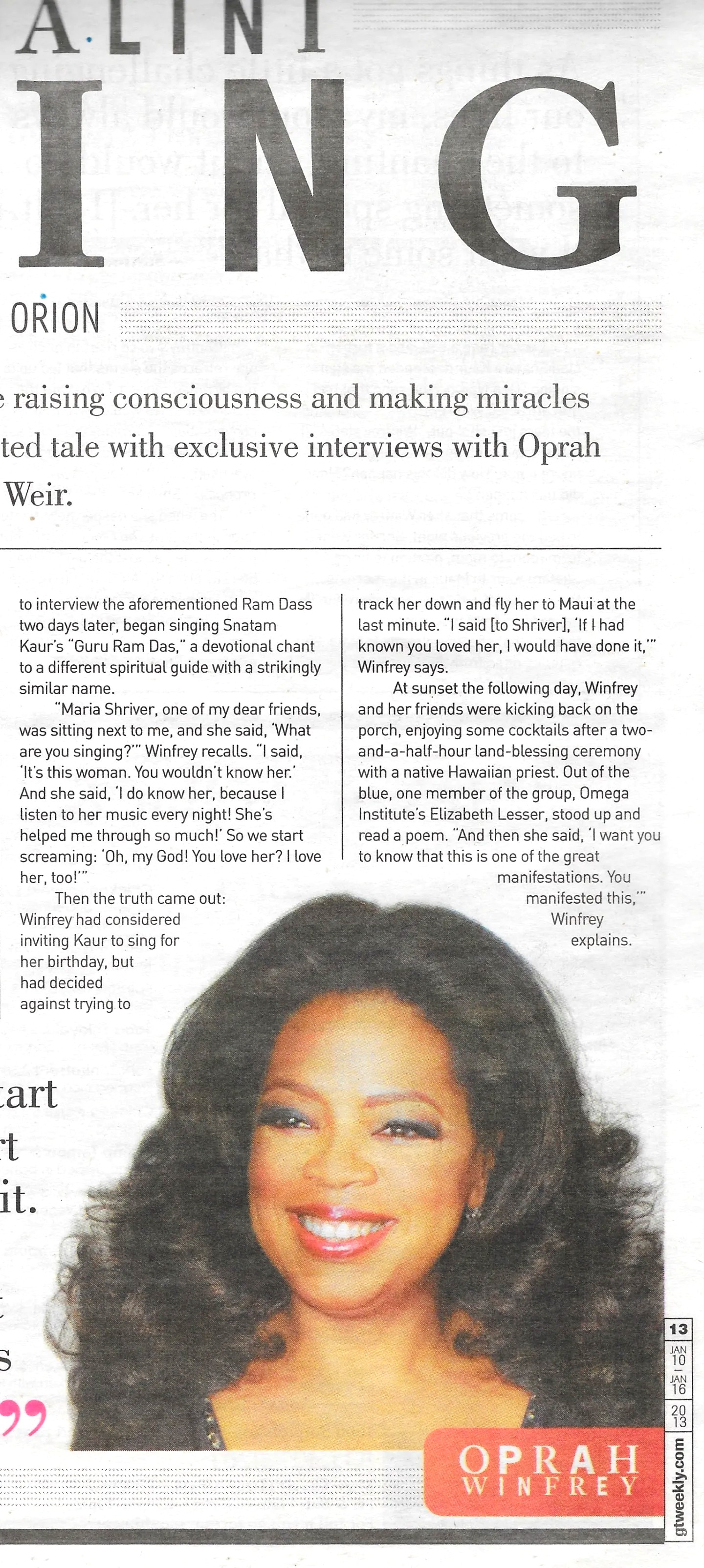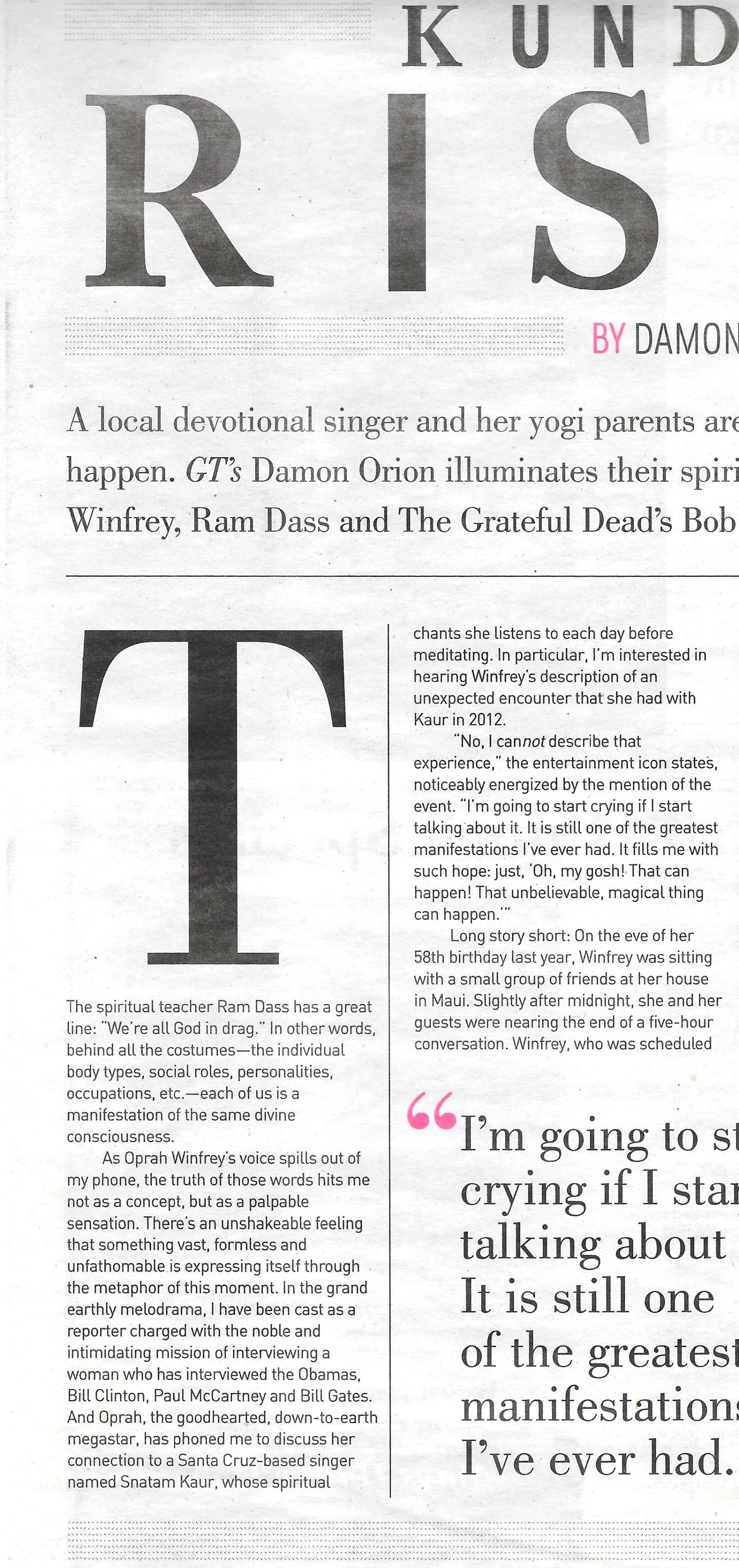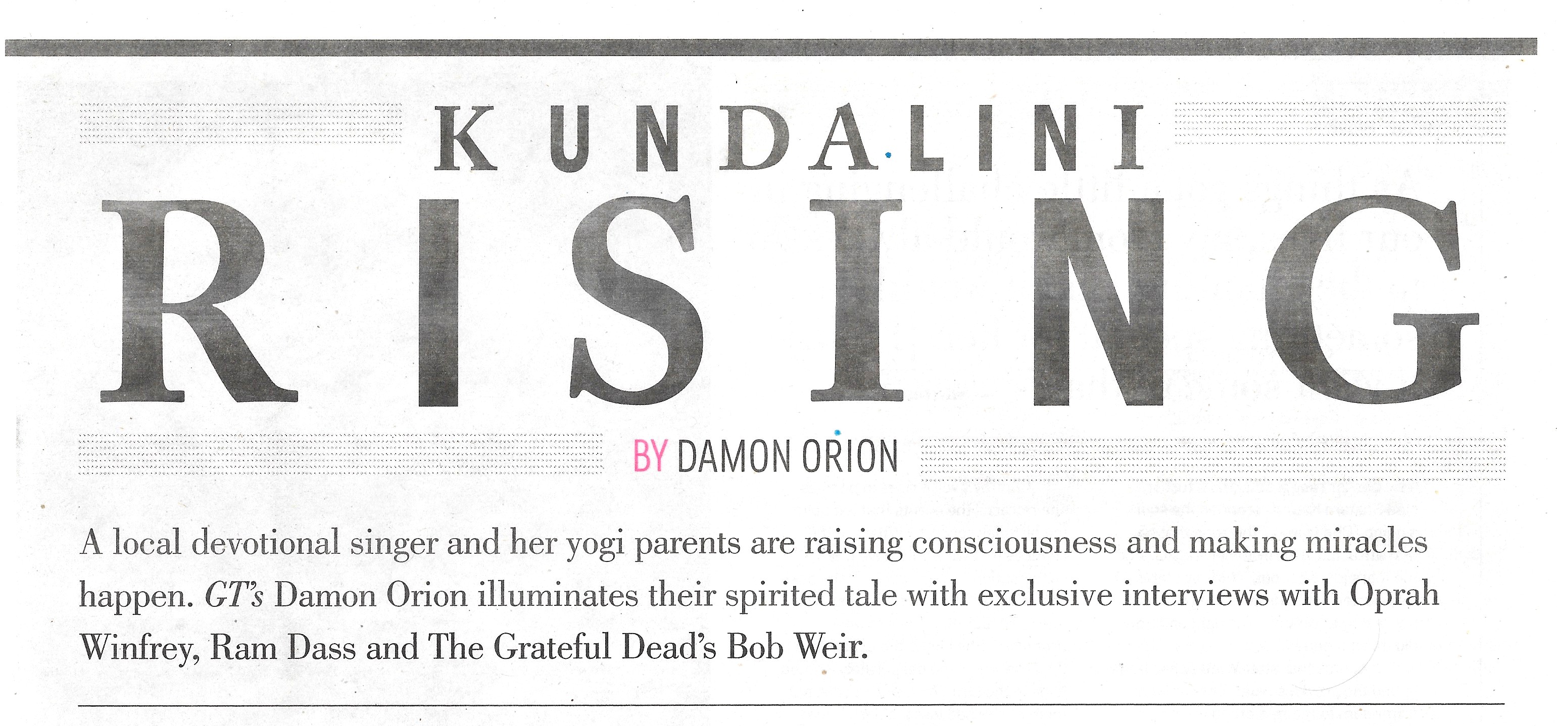 A local devotional singer and her yogi parents are raising consciousness and making miracles happen. GT’s Damon Orion illuminates their spirited tale with exclusive interviews with Oprah Winfrey, Ram Dass and The Grateful Dead’s Bob Weir.